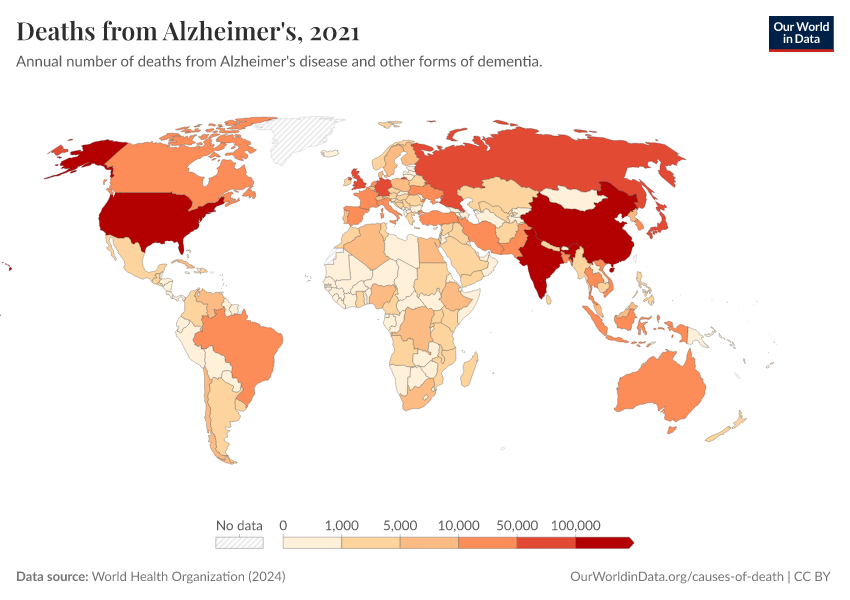 “Data Page: Deaths from Alzheimer's”, part of the following publication: Esteban Ortiz-Ospina and Max Roser (2016) - “Global Health”. Data adapted from World Health Organization. Retrieved from https://refactor-hide-legend.owid.pages.dev/grapher/deaths-from-alzheimers-other-dementias [online resource]How to cite this data
