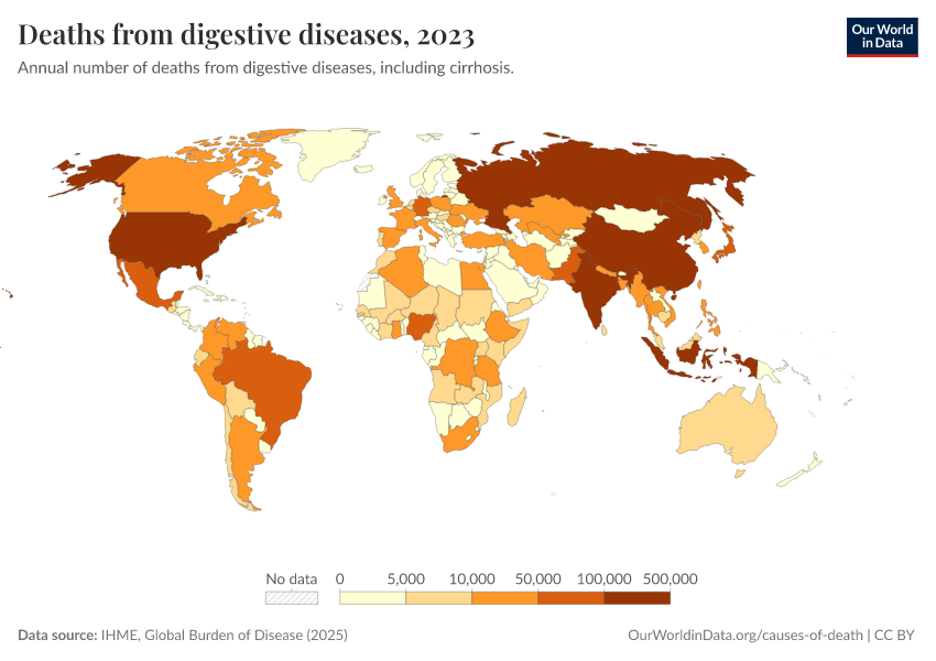 IHME, Global Burden of Disease (2025) – with major processing by Our World in Data. “Deaths from digestive diseases” [dataset]. IHME, Global Burden of Disease, “Global Burden of Disease - Deaths” [original data]. Retrieved March 4, 2026 from https://refactor-hide-legend.owid.pages.dev/grapher/deaths-from-digestive-diseases