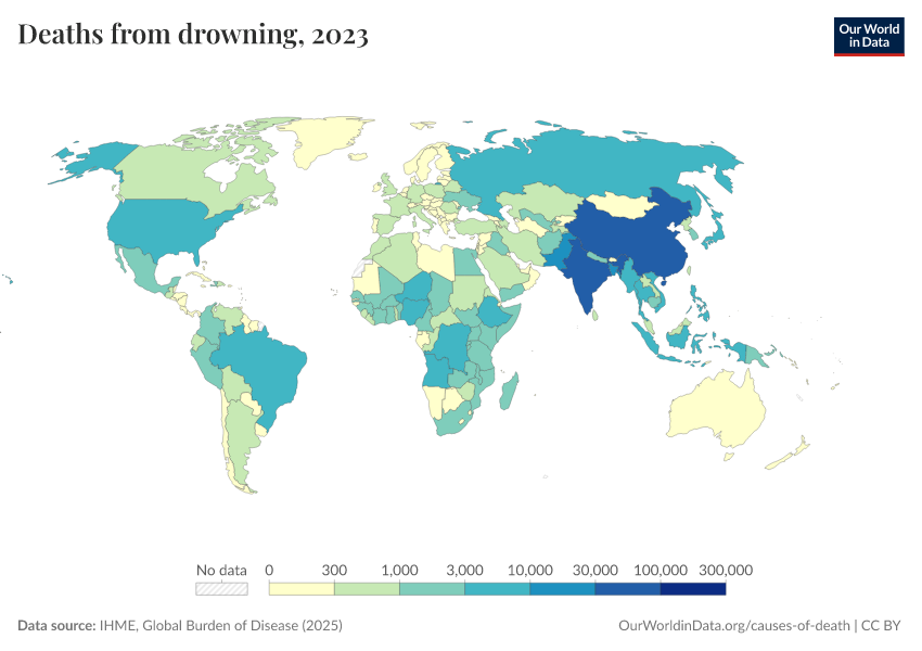 “Data Page: Deaths from drowning”, part of the following publication: Esteban Ortiz-Ospina and Max Roser (2016) - “Global Health”. Data adapted from IHME, Global Burden of Disease. Retrieved from https://refactor-hide-legend.owid.pages.dev/grapher/deaths-from-drowning [online resource]How to cite this data