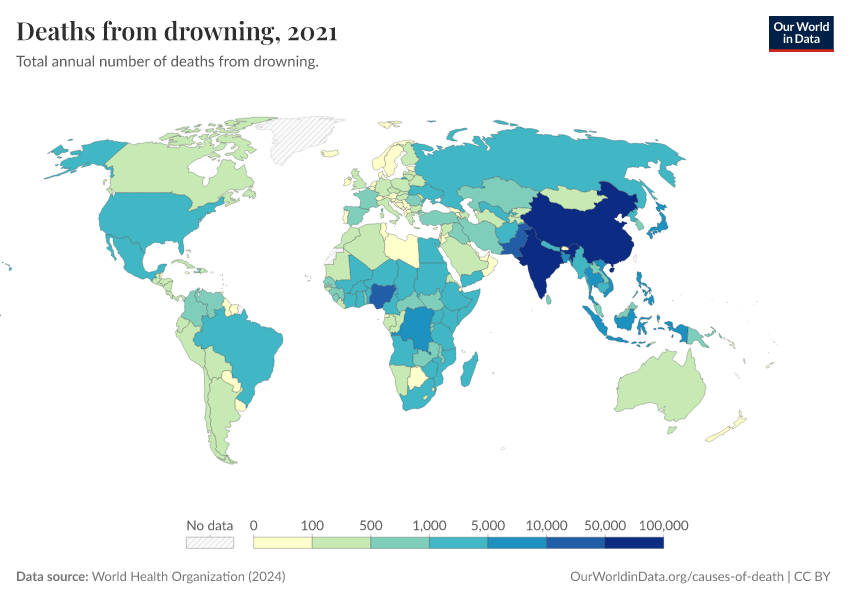 “Data Page: Deaths from drowning”, part of the following publication: Esteban Ortiz-Ospina and Max Roser (2016) - “Global Health”. Data adapted from World Health Organization. Retrieved from https://refactor-hide-legend.owid.pages.dev/grapher/deaths-from-drowning-ghe [online resource]How to cite this data