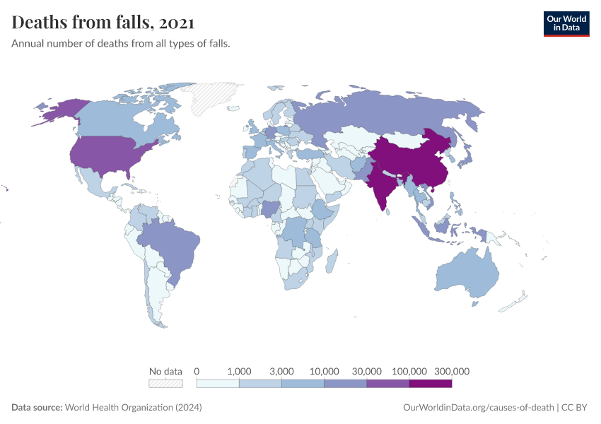 “Data Page: Deaths from falls”, part of the following publication: Esteban Ortiz-Ospina and Max Roser (2016) - “Global Health”. Data adapted from World Health Organization. Retrieved from https://refactor-hide-legend.owid.pages.dev/grapher/deaths-from-falls [online resource]How to cite this data