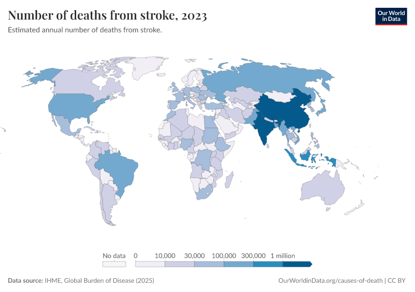 IHME, Global Burden of Disease (2025) – with major processing by Our World in Data. “Number of deaths from stroke” [dataset]. IHME, Global Burden of Disease, “Global Burden of Disease - Deaths” [original data]. Retrieved March 4, 2026 from https://refactor-hide-legend.owid.pages.dev/grapher/deaths-from-strokes