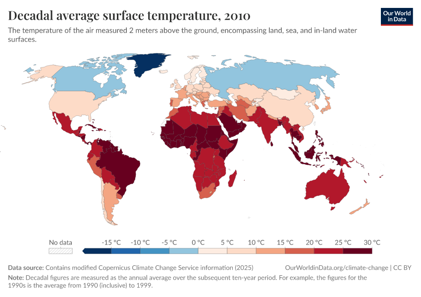 Contains modified Copernicus Climate Change Service information (2025) – with major processing by Our World in Data. “Decadal average surface temperature” [dataset]. Contains modified Copernicus Climate Change Service information, “ERA5 monthly averaged data on single levels from 1940 to present 2” [original data]. Retrieved March 4, 2026 from https://refactor-hide-legend.owid.pages.dev/grapher/decadal-average-surface-temperature