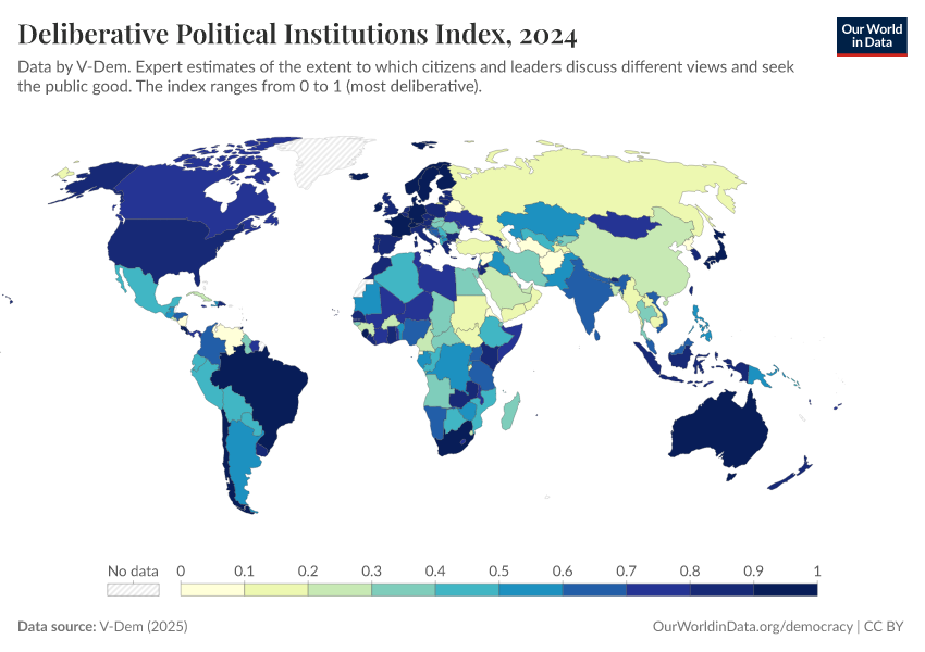 V-Dem (2025) – processed by Our World in Data. “Deliberative political institutions index – V-Dem” [dataset]. V-Dem, “Democracy report v15” [original data]. Retrieved March 4, 2026 from https://refactor-hide-legend.owid.pages.dev/grapher/deliberative-political-institutions-index