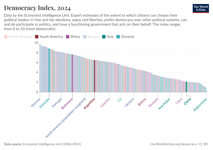 Economist Intelligence Unit (2006-2024) – processed by Our World in Data. “Democracy index – Economist Intelligence Unit” [dataset]. Economist Intelligence Unit, “Democracy Index 2021: The China challenge”; Economist Intelligence Unit, “Democracy Index 2022: Frontline democracy and the battle for Ukraine”; Economist Intelligence Unit, “Democracy Index 2023: Age of Conflict”; Economist Intelligence Unit, “Democracy Index 2024: What's wrong with representative democracy?”; Gapminder, “Democracy Index v4”; Various sources, “Population” [original data]. Retrieved March 4, 2026 from https://refactor-hide-legend.owid.pages.dev/grapher/democracy-index-eiu