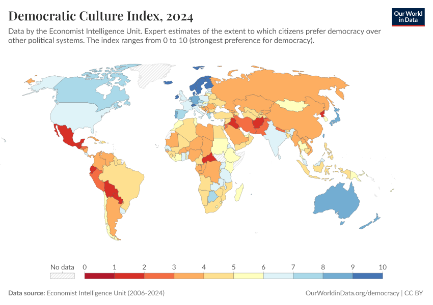 Economist Intelligence Unit (2006-2024) – processed by Our World in Data. “Democratic Culture Index” [dataset]. Economist Intelligence Unit, “Democracy Index 2021: The China challenge”; Economist Intelligence Unit, “Democracy Index 2022: Frontline democracy and the battle for Ukraine”; Economist Intelligence Unit, “Democracy Index 2023: Age of Conflict”; Economist Intelligence Unit, “Democracy Index 2024: What's wrong with representative democracy?”; Gapminder, “Democracy Index v4”; Various sources, “Population” [original data]. Retrieved March 4, 2026 from https://refactor-hide-legend.owid.pages.dev/grapher/democratic-culture-index-eiu