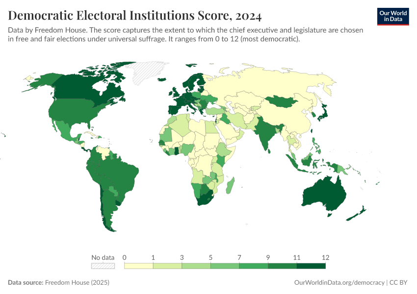 Freedom House (2025) – processed by Our World in Data. “Democratic Electoral Institutions Score” [dataset]. Freedom House, “Freedom in the World” [original data]. Retrieved March 4, 2026 from https://refactor-hide-legend.owid.pages.dev/grapher/democratic-electoral-institutions-fh