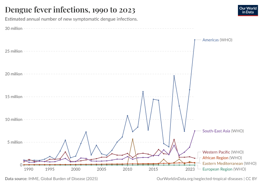 “Data Page: Dengue fever infections”, part of the following publication: Esteban Ortiz-Ospina and Max Roser (2016) - “Global Health”. Data adapted from IHME, Global Burden of Disease. Retrieved from https://refactor-hide-legend.owid.pages.dev/grapher/dengue-incidence [online resource]How to cite this data