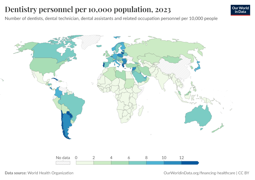 “Data Page: Dentistry personnel per 10,000 population”. Our World in Data (2026). Data adapted from World Health Organization. Retrieved from https://refactor-hide-legend.owid.pages.dev/grapher/dentistry-personnel-per-1000 [online resource]How to cite this data