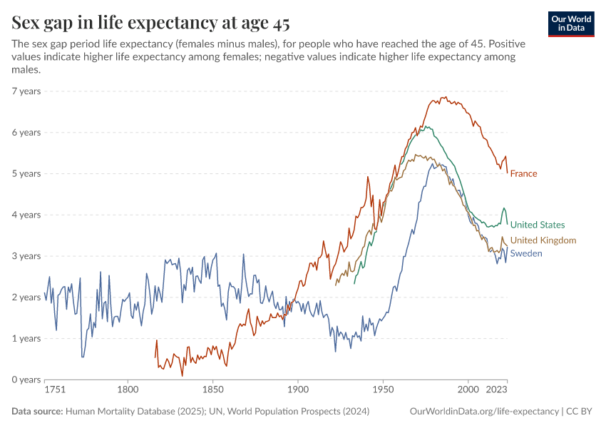 Human Mortality Database (2025); UN, World Population Prospects (2024) – with major processing by Our World in Data. “Life expectancy at 45 – HMD – female-male difference, period tables” [dataset]. Human Mortality Database, “Human Mortality Database”; United Nations, “World Population Prospects” [original data]. Retrieved March 4, 2026 from https://refactor-hide-legend.owid.pages.dev/grapher/difference-in-female-and-male-life-expectancy-at-age-45