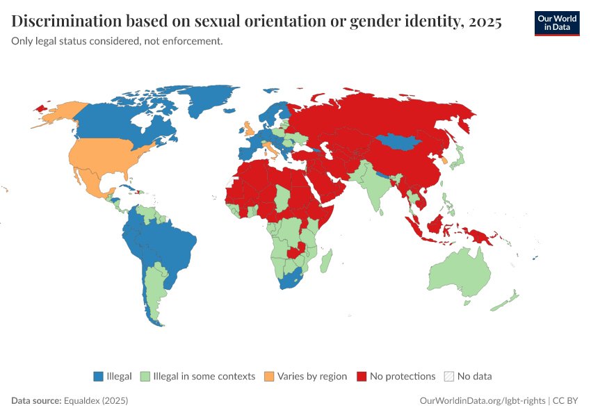 Equaldex (2025) – with major processing by Our World in Data. “Discrimination based on sexual orientation or gender identity” [dataset]. Equaldex, “Equaldex” [original data]. Retrieved March 4, 2026 from https://refactor-hide-legend.owid.pages.dev/grapher/discrimination-lgbt-equaldex