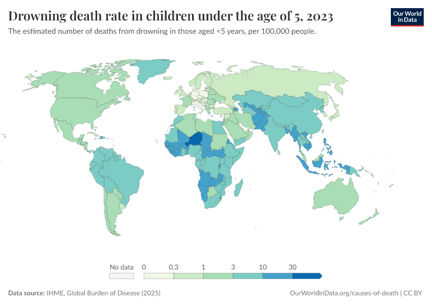 IHME, Global Burden of Disease (2025) – with major processing by Our World in Data. “Drowning death rate in children under the age of 5” [dataset]. IHME, Global Burden of Disease, “Global Burden of Disease - Deaths” [original data]. Retrieved March 4, 2026 from https://refactor-hide-legend.owid.pages.dev/grapher/drowning-death-rates-under-5