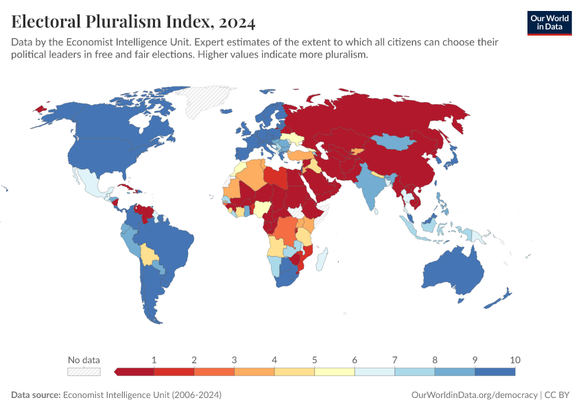 Economist Intelligence Unit (2006-2024) – processed by Our World in Data. “Electoral Pluralism Index” [dataset]. Economist Intelligence Unit, “Democracy Index 2021: The China challenge”; Economist Intelligence Unit, “Democracy Index 2022: Frontline democracy and the battle for Ukraine”; Economist Intelligence Unit, “Democracy Index 2023: Age of Conflict”; Economist Intelligence Unit, “Democracy Index 2024: What's wrong with representative democracy?”; Gapminder, “Democracy Index v4”; Various sources, “Population” [original data]. Retrieved March 4, 2026 from https://refactor-hide-legend.owid.pages.dev/grapher/electoral-pluralism-index-eiu