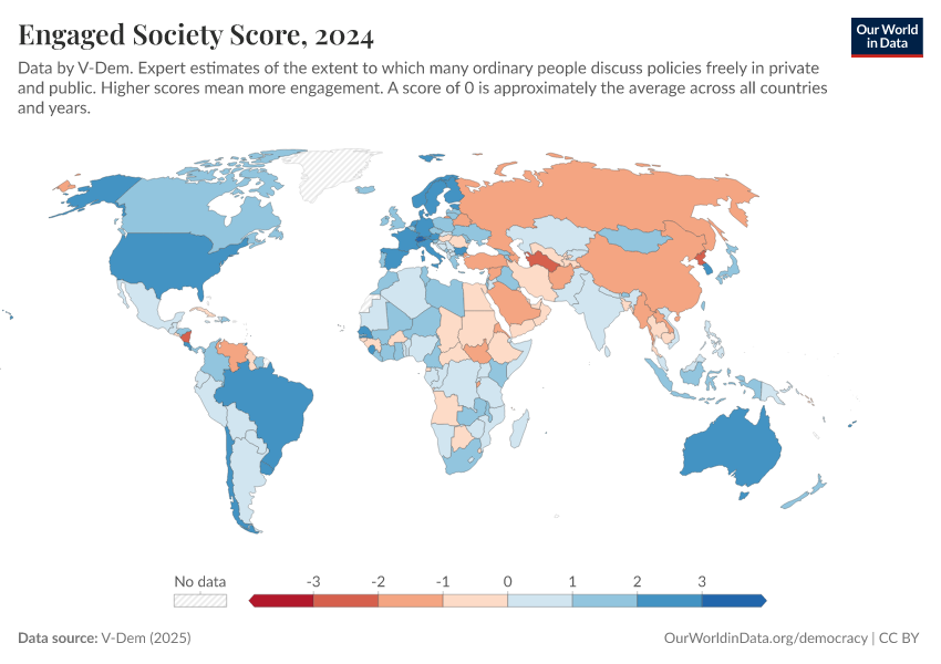 “Data Page: Engaged society”, part of the following publication: Bastian Herre, Lucas Rodés-Guirao, and Esteban Ortiz-Ospina (2013) - “Democracy”. Data adapted from V-Dem. Retrieved from https://refactor-hide-legend.owid.pages.dev/grapher/engaged-society-score [online resource]How to cite this data