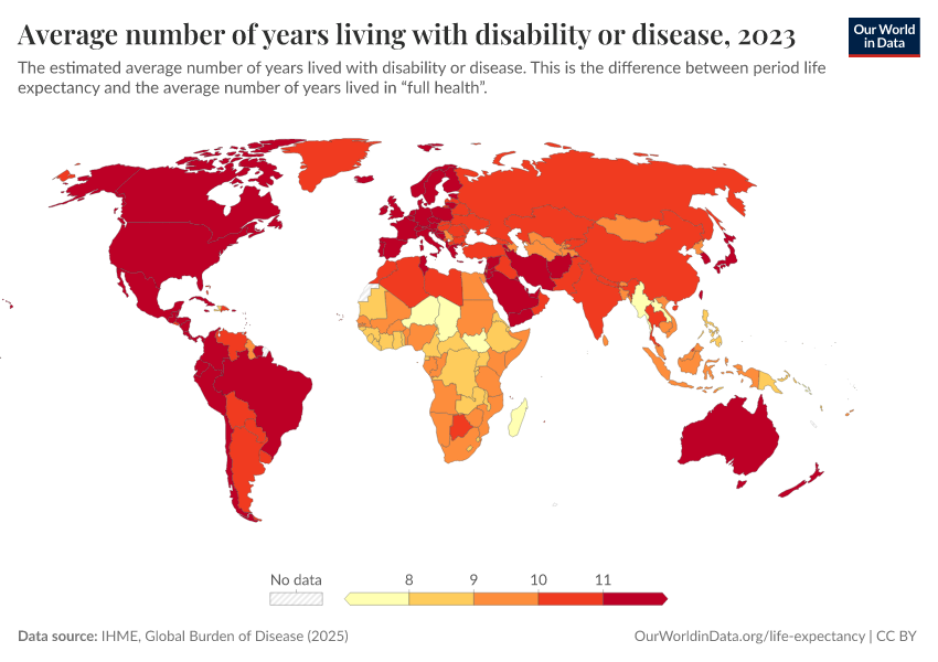 “Data Page: Average number of years living with disability or disease”, part of the following publication: Saloni Dattani, Lucas Rodés-Guirao, Hannah Ritchie, Esteban Ortiz-Ospina, and Max Roser (2023) - “Life Expectancy”. Data adapted from IHME, Global Burden of Disease. Retrieved from https://refactor-hide-legend.owid.pages.dev/grapher/expected-years-of-living-with-disability-or-disease-burden [online resource]How to cite this data