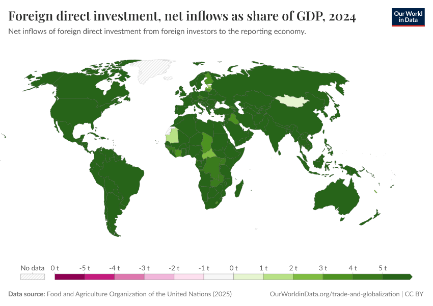 “Data Page: Foreign direct investment, net inflows as share of GDP”. Our World in Data (2026). Data adapted from IMF International Financial Statistics and Balance of Payments; World Bank International Debt Statistics and GDP estimates; and OECD GDP estimates. Retrieved from https://refactor-hide-legend.owid.pages.dev/grapher/foreign-direct-investment-net-inflows-as-share-of-gdp [online resource]How to cite this data