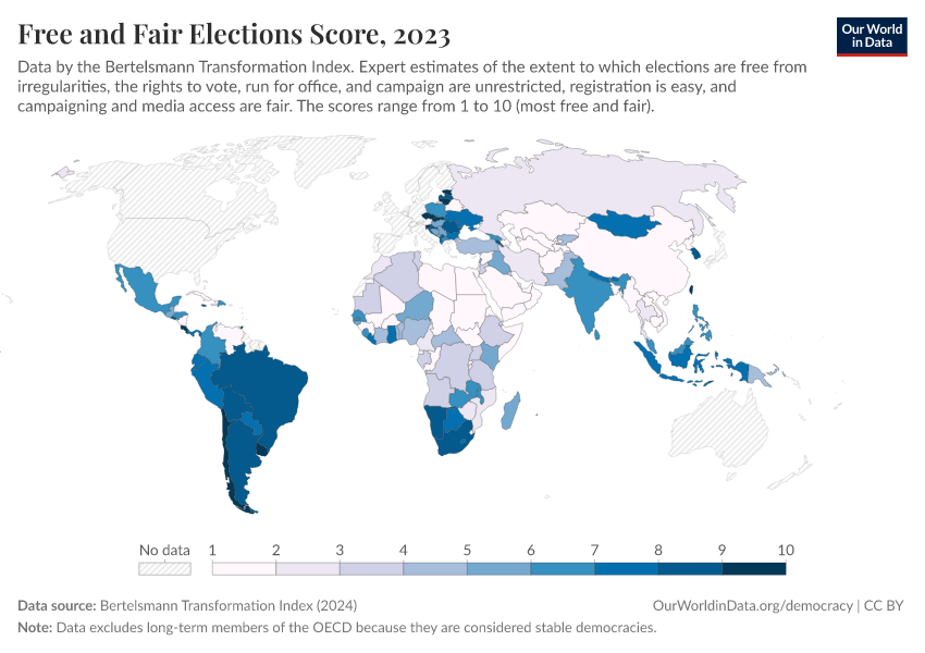 Bertelsmann Transformation Index (2024) – processed by Our World in Data. “Free and Fair Elections Score” [dataset]. Bertelsmann Transformation Index, “Bertelsmann Transformation Index, Scores” [original data]. Retrieved March 4, 2026 from https://refactor-hide-legend.owid.pages.dev/grapher/free-fair-elections-bti