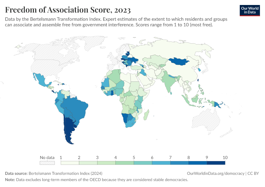 “Data Page: Freedom of Association Score”, part of the following publication: Bastian Herre, Lucas Rodés-Guirao, and Esteban Ortiz-Ospina (2013) - “Democracy”. Data adapted from Bertelsmann Transformation Index. Retrieved from https://refactor-hide-legend.owid.pages.dev/grapher/freedom-of-association-score-bti [online resource]How to cite this data