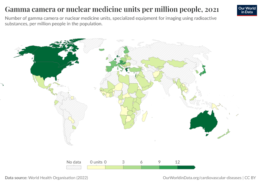 World Health Organisation (2022) – with minor processing by Our World in Data. “Gamma camera or nuclear medicine units per million people” [dataset]. World Health Organisation, “Global atlas of medical devices” [original data]. Retrieved March 4, 2026 from https://refactor-hide-legend.owid.pages.dev/grapher/gamma-camera-or-nuclear-medicine-availability