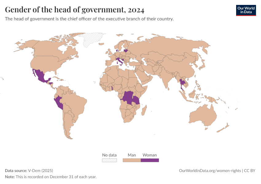 V-Dem (2025) – processed by Our World in Data. “Gender of the head of government” [dataset]. V-Dem, “Democracy report v15” [original data]. Retrieved March 4, 2026 from https://refactor-hide-legend.owid.pages.dev/grapher/gender-of-the-head-of-government