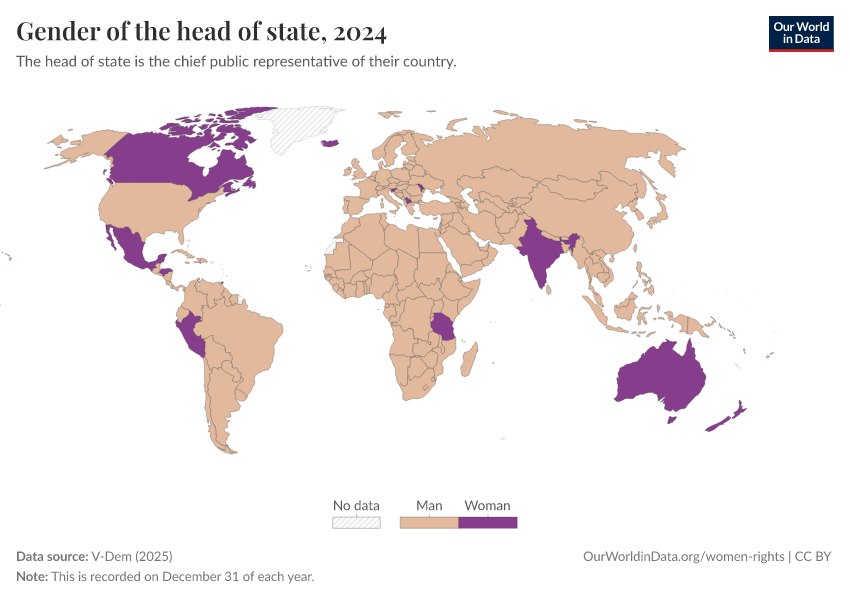 V-Dem (2025) – processed by Our World in Data. “Gender of the head of state” [dataset]. V-Dem, “Democracy report v15” [original data]. Retrieved March 4, 2026 from https://refactor-hide-legend.owid.pages.dev/grapher/gender-of-the-head-of-state