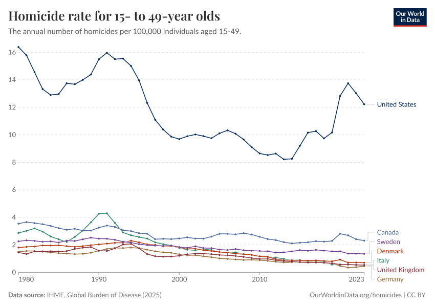 “Data Page: Homicide rate for 15- to 49-year olds”, part of the following publication: Esteban Ortiz-Ospina and Max Roser (2016) - “Global Health”. Data adapted from IHME, Global Burden of Disease. Retrieved from https://refactor-hide-legend.owid.pages.dev/grapher/homicide-rate-in-15--to-49-year-olds [online resource]How to cite this data