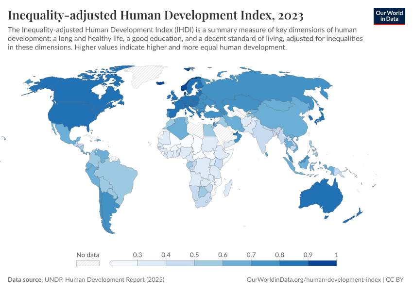 UNDP, Human Development Report (2025) – with minor processing by Our World in Data. “Inequality-adjusted Human Development Index – UNDP” [dataset]. UNDP, Human Development Report, “Human Development Report” [original data]. Retrieved March 4, 2026 from https://refactor-hide-legend.owid.pages.dev/grapher/inequality-adjusted-human-development-index