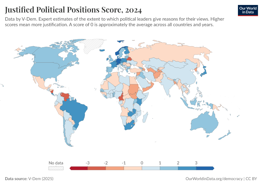 V-Dem (2025) – processed by Our World in Data. “Justified political positions – V-Dem” [dataset]. V-Dem, “Democracy report v15” [original data]. Retrieved March 4, 2026 from https://refactor-hide-legend.owid.pages.dev/grapher/justified-political-positions-score