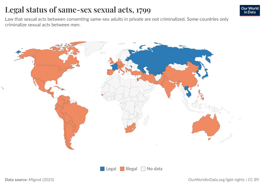 “Data Page: Legal status of same-sex sexual acts”, part of the following publication: Bastian Herre and Pablo Arriagada (2023) - “LGBT+ Rights”. Data adapted from Mignot. Retrieved from https://refactor-hide-legend.owid.pages.dev/grapher/legal-status-of-same-sex-sexual-acts [online resource]How to cite this data