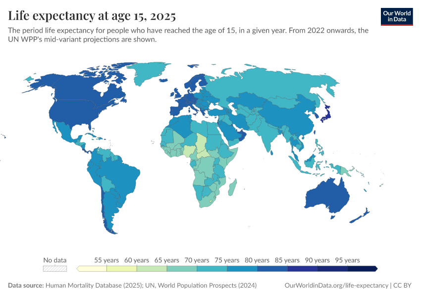 Human Mortality Database (2025); UN, World Population Prospects (2024) – with major processing by Our World in Data. “Life expectancy at 15 – HMD, UN WPP – period tables, with UN medium projections” [dataset]. Human Mortality Database, “Human Mortality Database”; United Nations, “World Population Prospects” [original data]. Retrieved March 4, 2026 from https://refactor-hide-legend.owid.pages.dev/grapher/life-expectancy-at-age-15