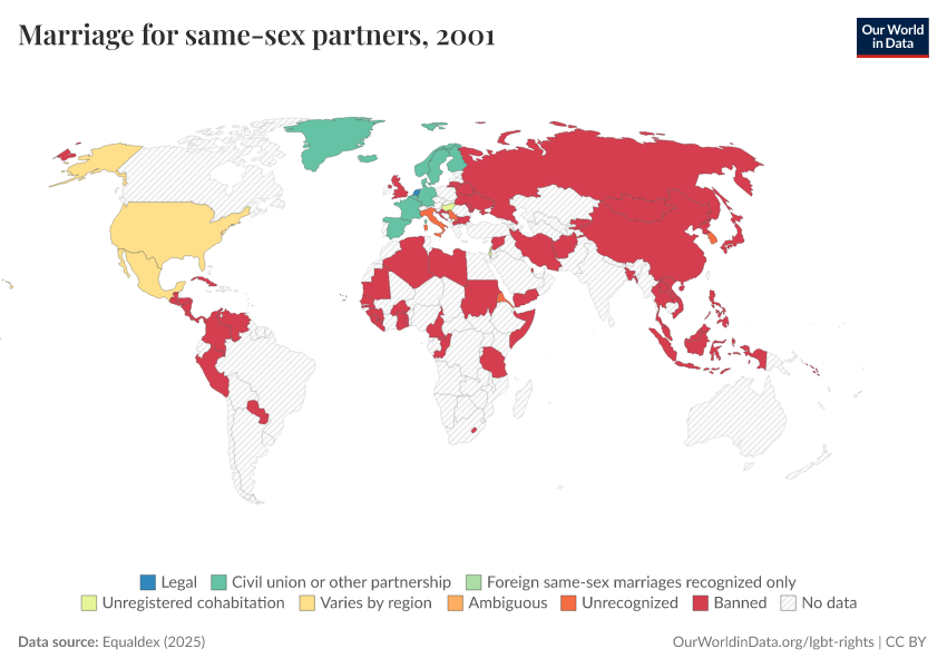 “Data Page: Marriage for same-sex partners”, part of the following publication: Bastian Herre and Pablo Arriagada (2023) - “LGBT+ Rights”. Data adapted from Equaldex. Retrieved from https://refactor-hide-legend.owid.pages.dev/grapher/marriage-same-sex-partners-equaldex [online resource]How to cite this data