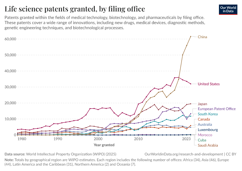 World Intellectual Property Organization (WIPO) (2025) – processed by Our World in Data. “Life science patents granted, by filing office” [dataset]. World Intellectual Property Organization (WIPO), “World Intellectual Property Organization - Patents 2025-05-01” [original data]. Retrieved March 4, 2026 from https://refactor-hide-legend.owid.pages.dev/grapher/medicine-and-biotechnology-patents-granted-by-filing-office