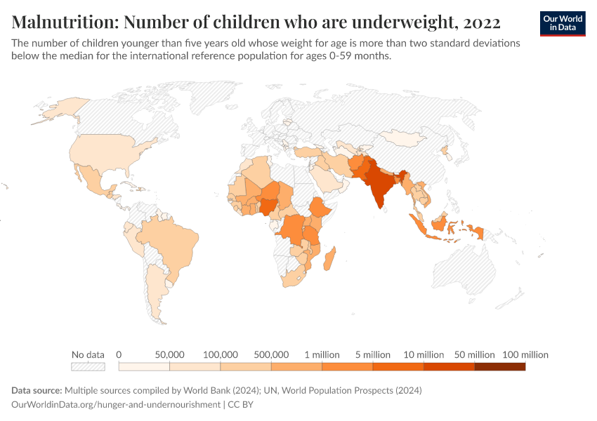 Multiple sources compiled by World Bank (2024); UN, World Population Prospects (2024) – processed by Our World in Data. “Number of underweight children – UN WPP” [dataset]. UNICEF, WHO, World Bank, “World Development Indicators”; United Nations, “World Population Prospects” [original data]. Retrieved March 4, 2026 from https://refactor-hide-legend.owid.pages.dev/grapher/number-of-children-who-are-underweight