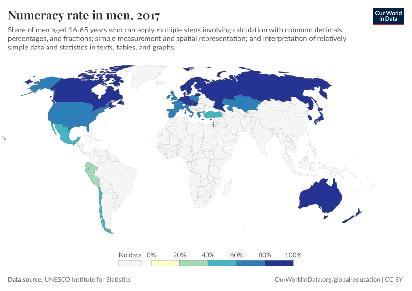 UNESCO Institute for Statistics – processed by Our World in Data. “Numeracy rate in men” [dataset]. UNESCO Institute for Statistics, “Data from multiple sources” [original data]. Retrieved March 4, 2026 from https://refactor-hide-legend.owid.pages.dev/grapher/numeracy-rate-in-adult-men