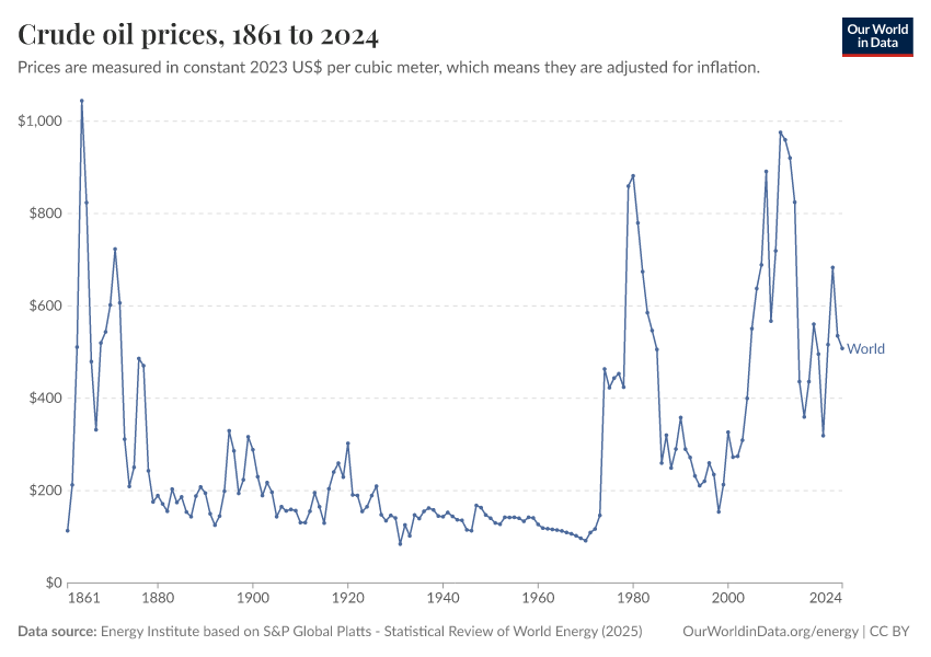 “Data Page: Oil price - Crude prices since 1861”, part of the following publication: Hannah Ritchie, Pablo Rosado, and Max Roser (2023) - “Energy”. Data adapted from Energy Institute. Retrieved from https://refactor-hide-legend.owid.pages.dev/grapher/oil-prices-inflation-adjusted [online resource]How to cite this data