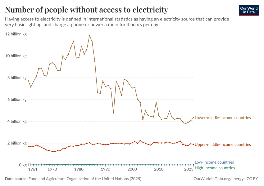 Data compiled from multiple sources by World Bank – with major processing by Our World in Data. “Number of people without access to electricity – World Bank” [dataset]. SDG 7.1.1 Electrification Dataset, World Bank, via World Bank, “World Development Indicators 125”; United Nations Population Division, national statistical offices, and Eurostat, via World Bank, “World Development Indicators 125” [original data]. Retrieved March 4, 2026 from https://refactor-hide-legend.owid.pages.dev/grapher/people-without-electricity-country