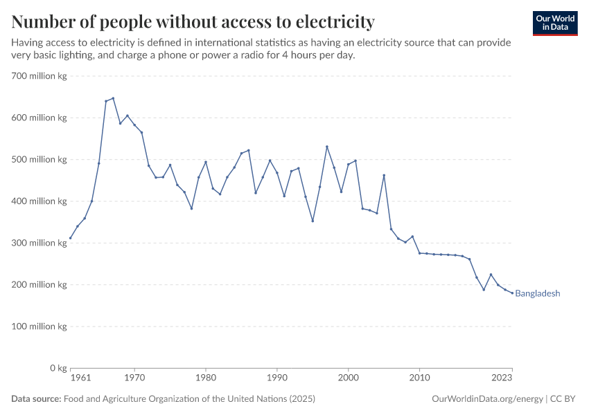 Data compiled from multiple sources by World Bank – with major processing by Our World in Data. “Number of people without access to electricity – World Bank” [dataset]. SDG 7.1.1 Electrification Dataset, World Bank, via World Bank, “World Development Indicators 125”; United Nations Population Division, national statistical offices, and Eurostat, via World Bank, “World Development Indicators 125” [original data]. Retrieved March 4, 2026 from https://refactor-hide-legend.owid.pages.dev/grapher/people-without-electricity-country