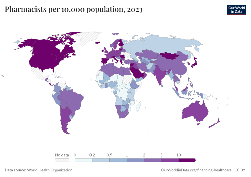 World Health Organization – processed by Our World in Data. “Pharmacists per 10,000 population” [dataset]. World Health Organization, “Data from multiple sources” [original data]. Retrieved March 4, 2026 from https://refactor-hide-legend.owid.pages.dev/grapher/pharmaceutical-personnel-per-1000