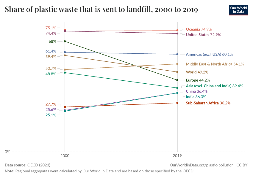 “Data Page: Share of plastic waste that is sent to landfill”, part of the following publication: Hannah Ritchie, Veronika Samborska, and Max Roser (2023) - “Plastic Pollution”. Data adapted from OECD. Retrieved from https://refactor-hide-legend.owid.pages.dev/grapher/plastic-waste-landfill [online resource]How to cite this data