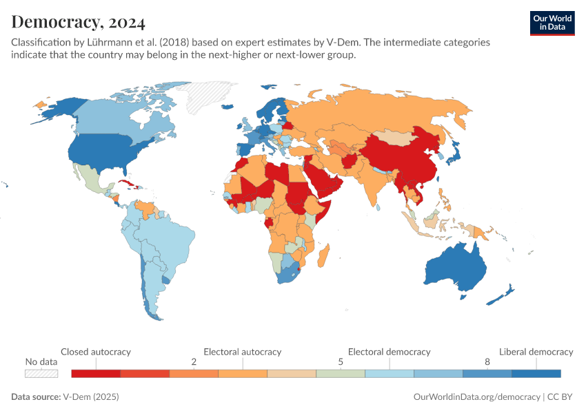“Data Page: Political regime”, part of the following publication: Bastian Herre, Lucas Rodés-Guirao, and Esteban Ortiz-Ospina (2013) - “Democracy”. Data adapted from V-Dem. Retrieved from https://refactor-hide-legend.owid.pages.dev/grapher/political-regime-amb-row [online resource]How to cite this data