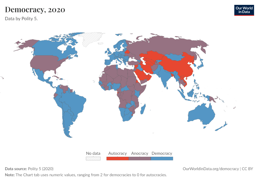 Polity 5 (2020) – processed by Our World in Data. “Democracy” [dataset]. Polity 5, “Polity5 Project, Political Regime Characteristics and Transitions, 1800-2018 5” [original data]. Retrieved March 4, 2026 from https://refactor-hide-legend.owid.pages.dev/grapher/political-regime-polity