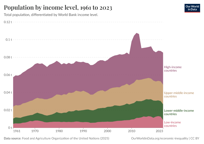 United Nations Population Division, national statistical offices, and Eurostat, via World Bank (2026) – processed by Our World in Data. “Population by income level” [dataset]. United Nations Population Division, national statistical offices, and Eurostat, via World Bank, “World Development Indicators 125” [original data]. Retrieved March 4, 2026 from https://refactor-hide-legend.owid.pages.dev/grapher/population-by-income-level