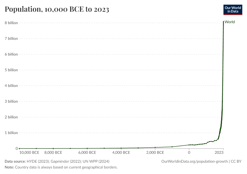 “Data Page: Population”, part of the following publication: Hannah Ritchie, Lucas Rodés-Guirao, Edouard Mathieu, Marcel Gerber, Esteban Ortiz-Ospina, Joe Hasell, and Max Roser (2023) - “Population Growth”. Data adapted from PBL Netherlands Environmental Assessment Agency, Gapminder, United Nations. Retrieved from https://refactor-hide-legend.owid.pages.dev/grapher/population [online resource]