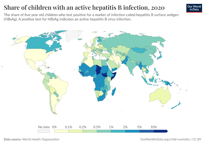 “Data Page: Share of children with an active hepatitis B infection”. Our World in Data (2026). Data adapted from World Health Organization. Retrieved from https://refactor-hide-legend.owid.pages.dev/grapher/prevalence-of-hepatitis-b-surface-antigen [online resource]How to cite this data