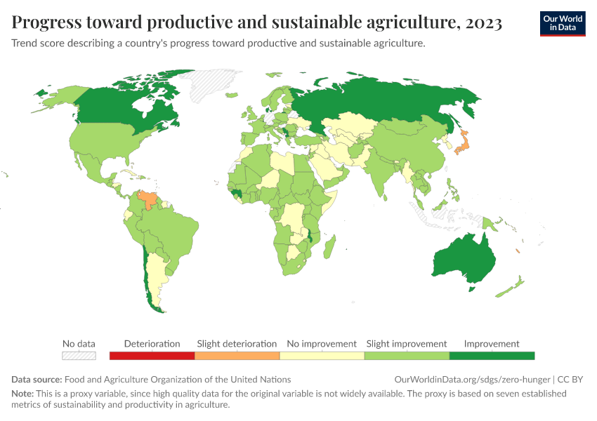 “Data Page: Progress toward productive and sustainable agriculture”. Our World in Data (2026). Data adapted from Food and Agriculture Organization of the United Nations. Retrieved from https://refactor-hide-legend.owid.pages.dev/grapher/progress-toward-productive-and-sustainable-agriculture [online resource]How to cite this data