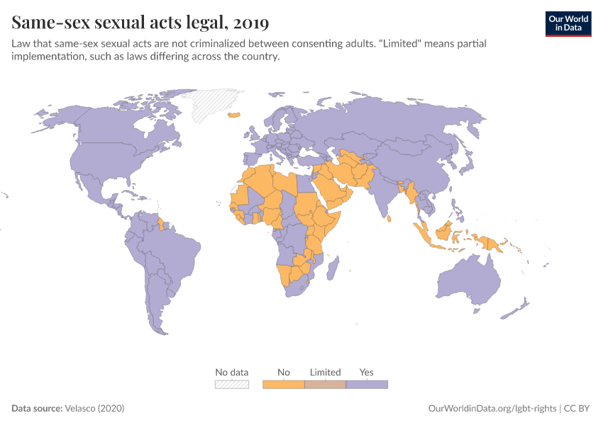 “Data Page: Same-sex sexual acts legal”, part of the following publication: Bastian Herre and Pablo Arriagada (2023) - “LGBT+ Rights”. Data adapted from Velasco. Retrieved from https://refactor-hide-legend.owid.pages.dev/grapher/same-sex-sexual-acts-legal [online resource]How to cite this data