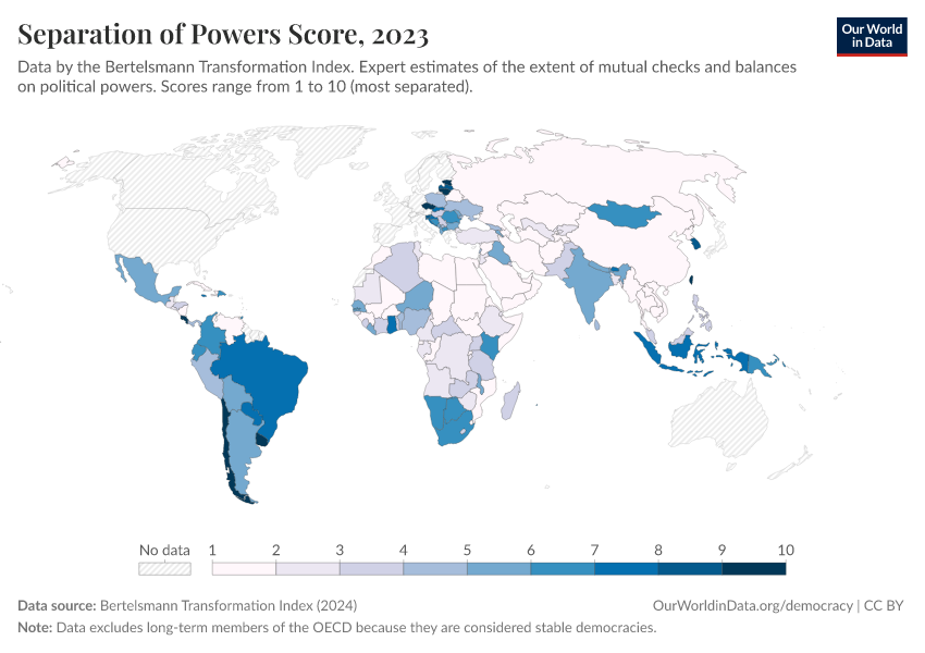 “Data Page: Separation of Powers Score”, part of the following publication: Bastian Herre, Lucas Rodés-Guirao, and Esteban Ortiz-Ospina (2013) - “Democracy”. Data adapted from Bertelsmann Transformation Index. Retrieved from https://refactor-hide-legend.owid.pages.dev/grapher/separation-of-powers-score-bti [online resource]How to cite this data