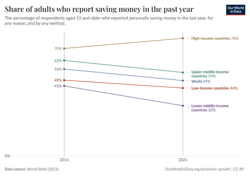 “Data Page: Share of adults who report saving money in the past year”, part of the following publication: Max Roser, Bertha Rohenkohl, Pablo Arriagada, Joe Hasell, Hannah Ritchie, and Esteban Ortiz-Ospina (2023) - “Economic Growth”. Data adapted from World Bank. Retrieved from https://refactor-hide-legend.owid.pages.dev/grapher/share-of-adults-who-report-saving-money-in-the-past-year [online resource]How to cite this data