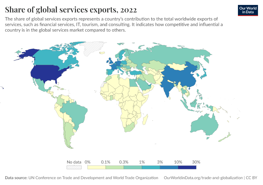 “Data Page: Share of global services exports”. Our World in Data (2026). Data adapted from UN Conference on Trade and Development and World Trade Organization. Retrieved from https://refactor-hide-legend.owid.pages.dev/grapher/share-of-global-services-exports [online resource]How to cite this data
