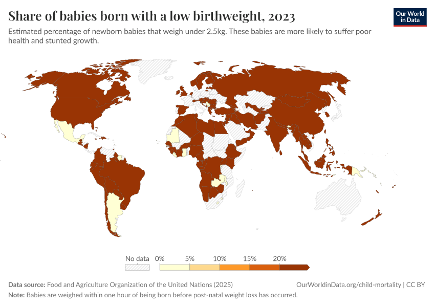 UNICEF and World Health Organization (WHO), via World Bank (2026) – processed by Our World in Data. “Share of babies born with a low birthweight” [dataset]. UNICEF and World Health Organization (WHO), via World Bank, “World Development Indicators 125” [original data]. Retrieved March 4, 2026 from https://refactor-hide-legend.owid.pages.dev/grapher/share-of-low-birthweight-babies-born